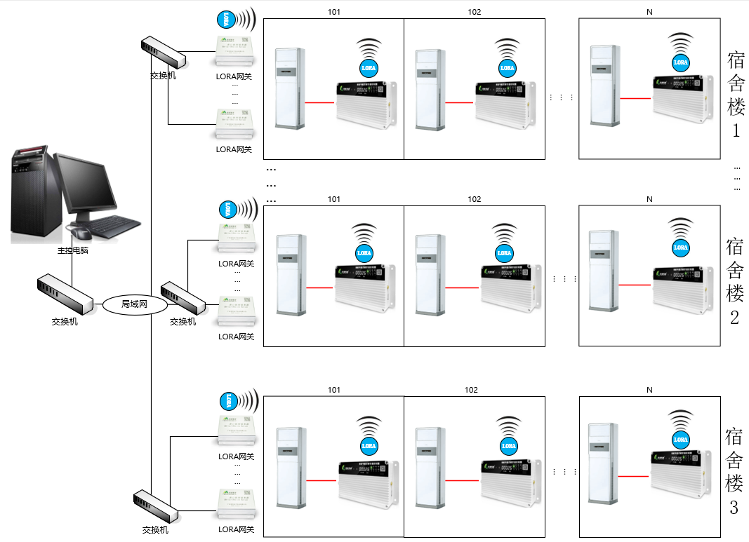 適用場景:宿舍樓分布分散或施工布線困難(如老舊建筑改造)。例如,某高校老舊宿舍樓因建筑結(jié)構(gòu)復(fù)雜,無法大規(guī)模布線,適合采用LORA無線組網(wǎng)方案。