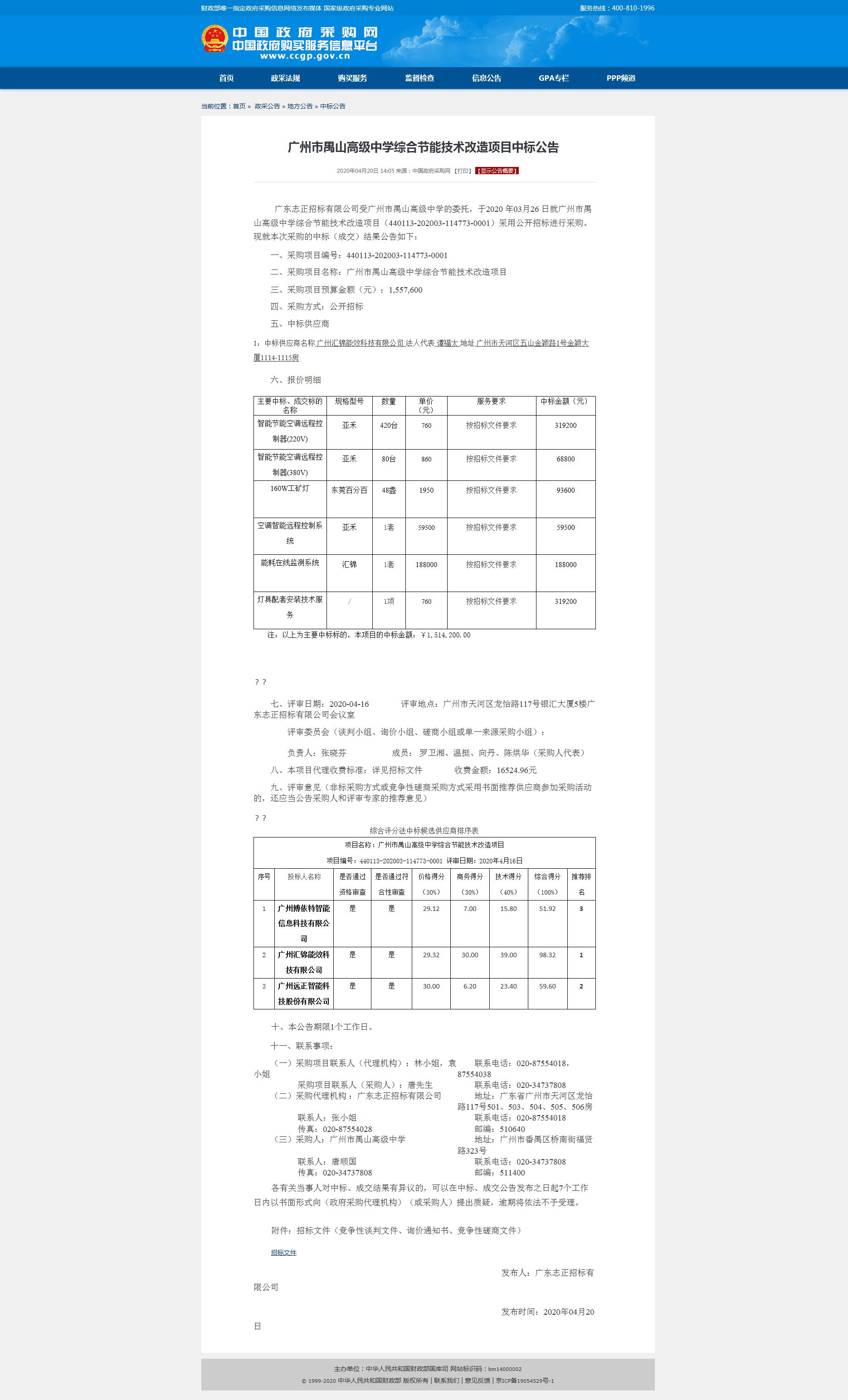 廣東志正招標有限公司受廣州市禺山高級中學的委托,于2020 0326 日就廣州市禺山高級中學綜合節(jié)能技術(shù)改造項目